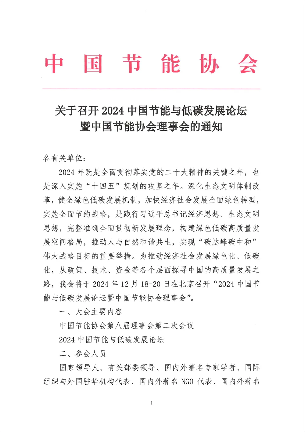 关于召开2024中国节能与低碳发展论坛暨中国节能协会理事会的通知
