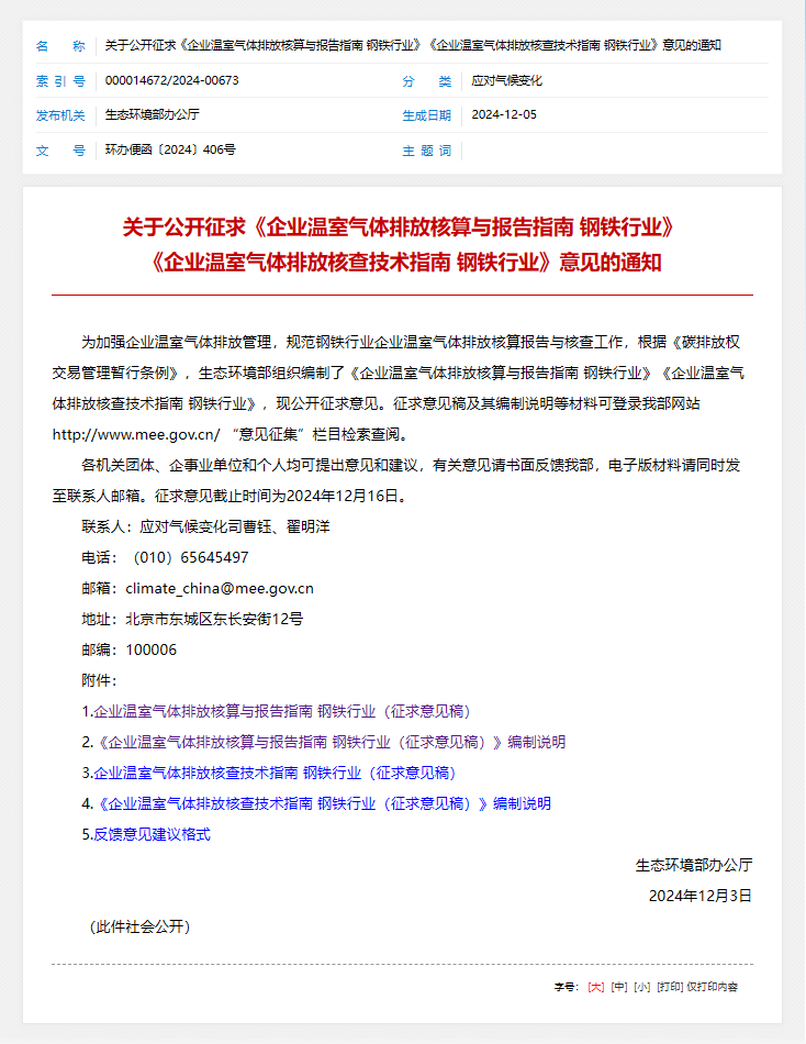 关于公开征求《企业温室气体排放核算与报告指南 钢铁行业》《企业温室气体排放核查技术指南 钢铁行业》意见的通知