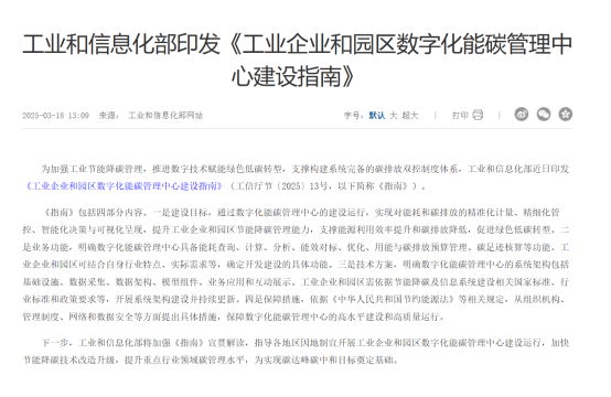 为加强工业节能降碳管理,推进数字技术赋能绿色低碳转型,支撑构建系统完备的碳排放双控制度体系,工业和信息化部近日印发《工业企业和园区数字化能碳管理中心建设指南》(工信厅节〔2025〕13号,以下简称《指南》)。为更好理解和落实《指南》,现就有关内容解读如下。